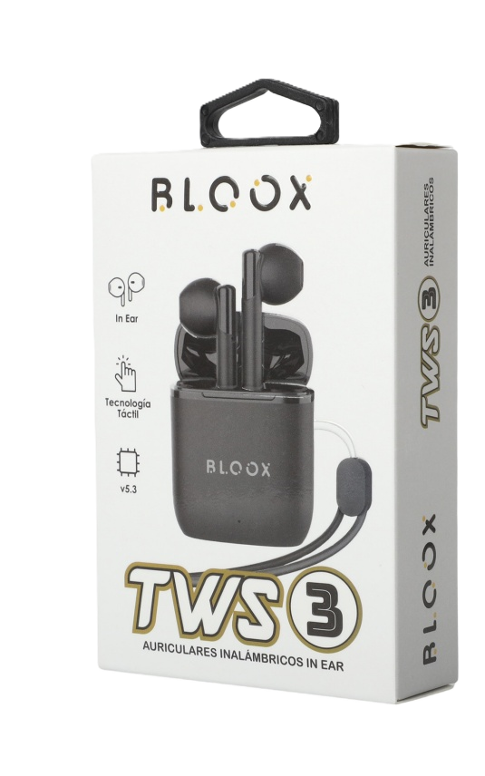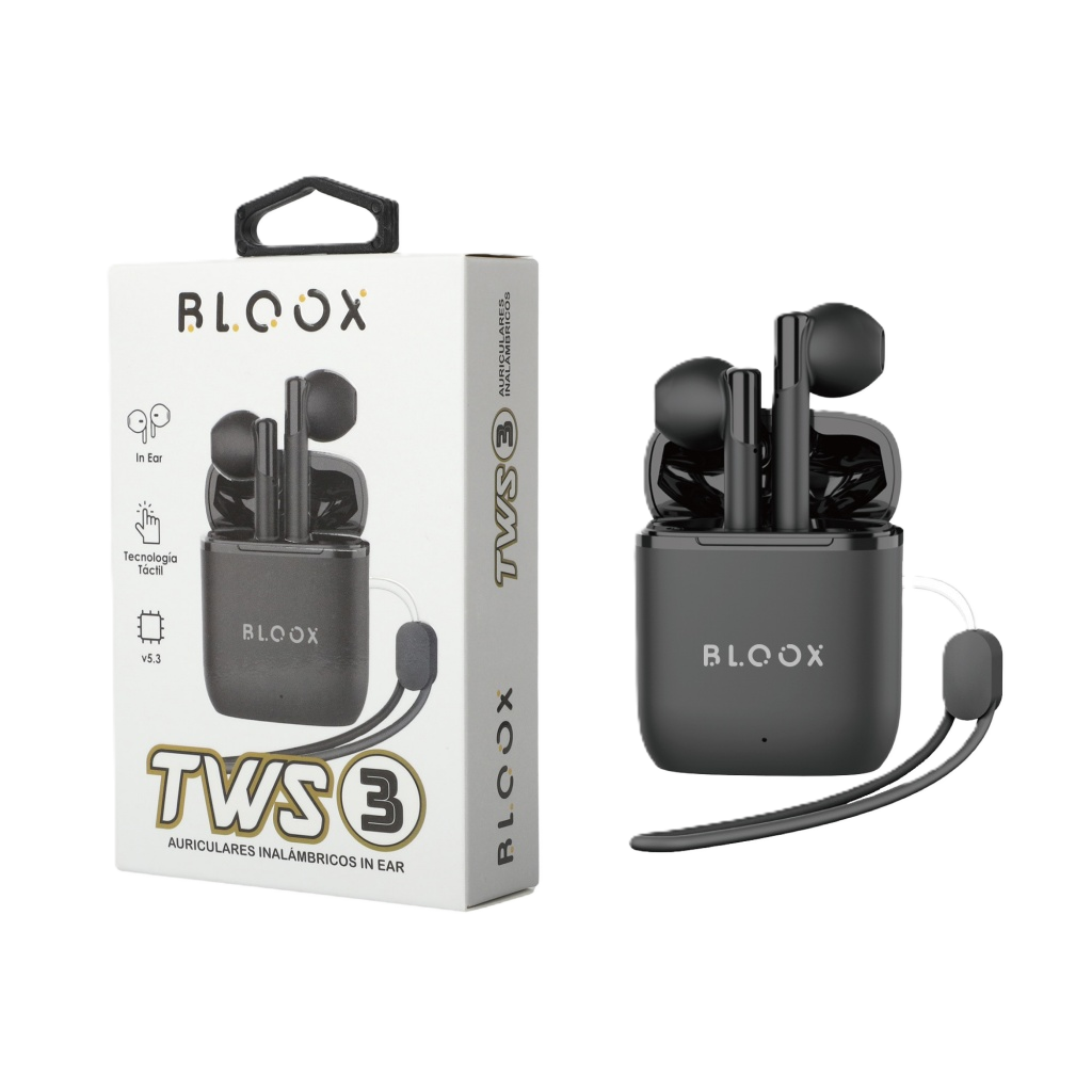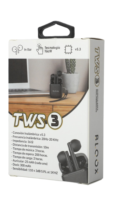 AURICULAR BLUETOOTH TWS 3 (BL-TWS-03/N) Auricular inalámbrico In Ear - Tecnología Táctil Conexión: v5.3 - Frecuencia: 20Hz-20KHz Distancia de transmisión: 10 metros Tiempo de música: 3 horas Tiempo de espera: 200 horas Tiempo de carga: 2 horas Dock: 300 mAh - Auricular 25 mAh cada uno Sensibilidad: 110+/- 3dB S.P.L...