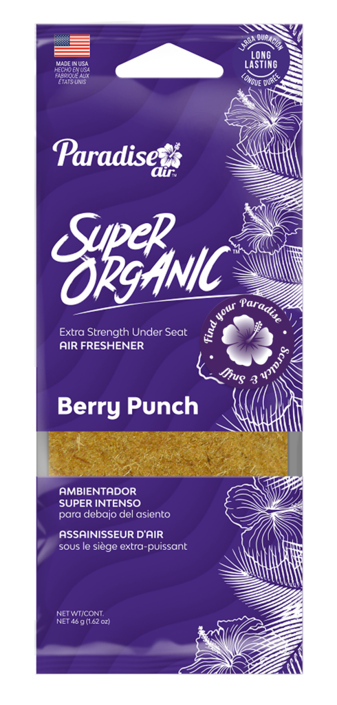 BERRY PUNCH ·Ambientador extra fuerte para debajo del asiento. ·Hecho en EE. UU. ·Úselo en su automóvil, casa u oficina. ·Fragancia de larga duración. ·Corte la bolsa y colóquela debajo de su asiento o en cualquier lugar donde desee un aroma fresco. La fragancia libera durante 75 dias. EAN: 810624030860