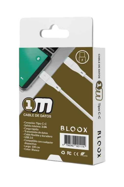 CABLE DE DATOS USB C a USB C (PVC) Cable flexible y duradero con protección extra Transmisión de datos de alta conductividad Salida máxima: 3.0A (carga rápida) Compatible con cualquier dispositivo Conexión: Tipo C-Tipo C (USB) Disponible en color Blanco Largo Total: 100 centímetros EAN: 4756262921114