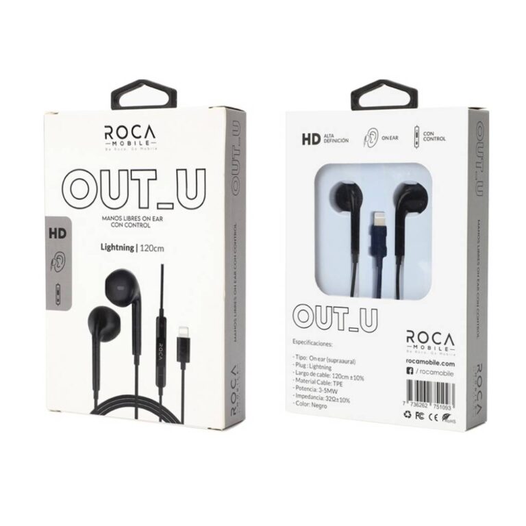 MANOS LIBRES OUT_U LIGHTNING (STEREO) Stereo / Universal / In Ear Material Cable: TPE Tipo: In Eear Plug: LIGHTNING Micrófono incorporado +/- control Potencia: 3.5 MW Disponible en color Negro Largo de Cable: 120 centímetros EAN: 7736262751093